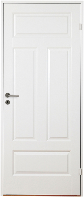 Vitmålad kompakt innerdörr med dekorskiva i en klassisk spegelindelning.