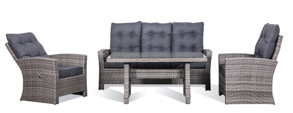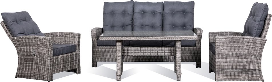 Liberty ger dig en klassisk soffgrupp i dubbel halvrund konstrotting / stor rund konstrotting. Färgen är neutral vilket gör att den passar in i de flesta utemiljöer. Stomme i väderbeständig aluminium. Sköna sittdynor klädda med grått tyg. Fåtöljerna har justerbara rygstöd. Här kan du tillbringa många lata stunder med familj och vänner.
