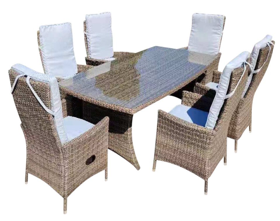 Sienna utemöbelgrupp med ett rejält matbord, sex fällbara stolar kompletta med rygg/sittdynor. Bordsskivan är är tillverkat av 5mm härdat glas. Möbelsatsens stommer är tillverkade av metall och sedan klädd i brun konstrotting. Bordets skiva av glas gör det mycket enkelt att städa från smuts och spillor. Stolarna har medföljande dynor som täcker både säte o det höga ryggstödet. Fäll bak ryggstödet till favoritposition och njut.