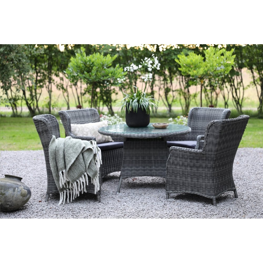 Matgruppen har ett runt bord i grå konstrotting med en robust aluminiumstomme och en stilren glasskiva som passar både ute- och inomhusmiljöer. Bordet kompletteras med bekväma fåtöljer som är tillverkade i grå konstrotting och har en stabil metallstomme. Fåtöljerna har en mörkgrå polyesterdyna för extra komfort, dock ingår inte ryggdyna, vilket ger möjlighet att anpassa efter egna önskemål. Bordet tillhör Jacksonville-serien och fåtöljerna kommer från Mercury-serien.