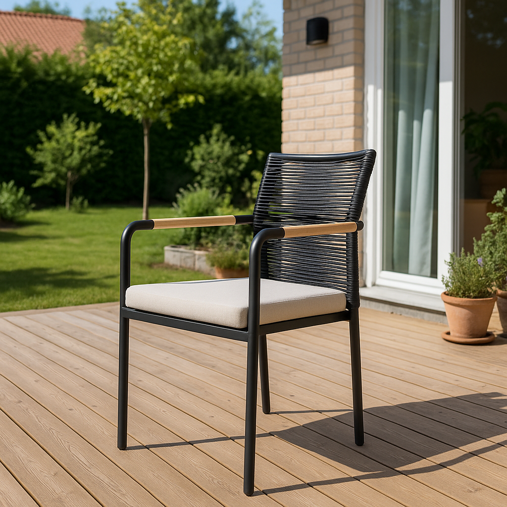 Saltö matgrupp för uteplatsen med ett rektangulärt matbord i massiv teak, tillsammans med Skanör karmstol i svart och teak med en beige skön sittdyna. En modern kombination på uteplatsen.