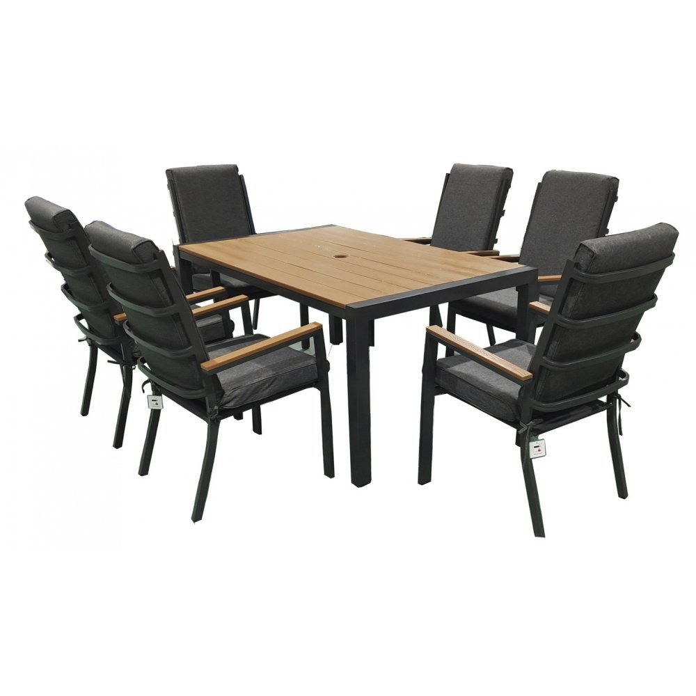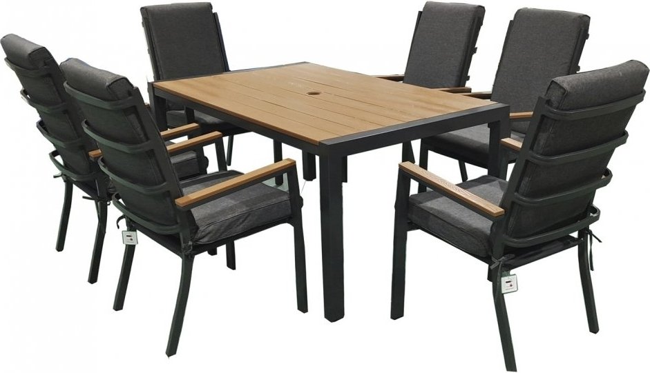 Matbordet har en brun toppskiva i slitstark polywood som ger ett trälikt utseende utan att kräva underhåll. Den stabila stommen är tillverkad i väderbeständig aluminium, vilket även gäller karmstolarna. Stolarna kompletteras med grå dynor som bidrar till både komfort och stil. Kombinationen av aluminium och polywood ger ett modernt och lättskött uttryck som håller över tid.